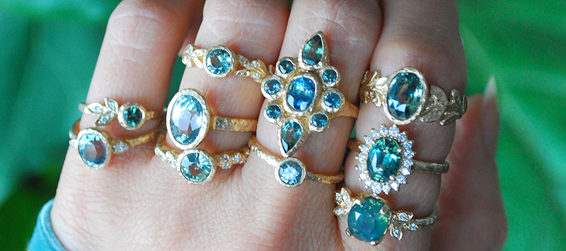 For instance, teal sapphires set into hand-sculpted gold reflect flowing water and golden sandy shores.