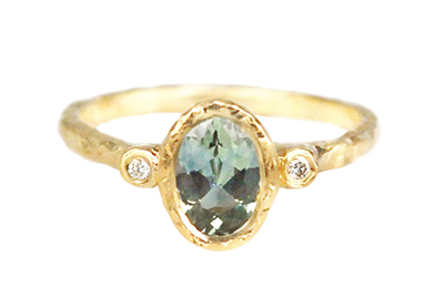 Artisanal 14k recycled yellow gold ring featuring an oval 1.5ct (7×5.5mm) green sapphire and two accent F/G VS-SI diamonds.