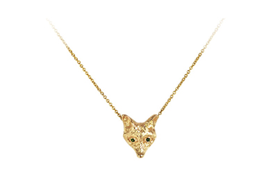 14k yellow gold fox pendant with two green diamonds on a 16″ gold chain