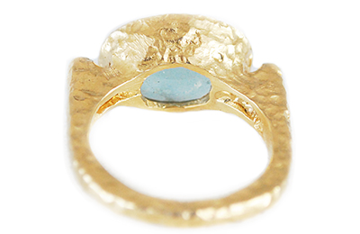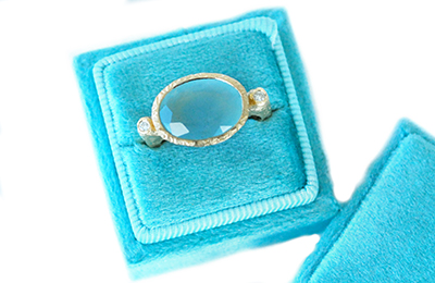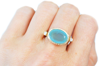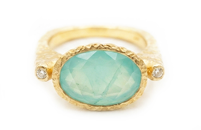 A right hand statement 14k yellow gold ring featuring a striking oval 4.84ct aquamarine $250 sitting between two natural accent diamonds 0.05tcw