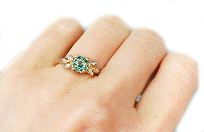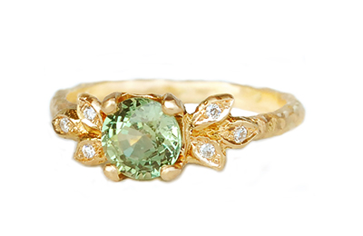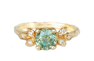 This organic ring design in 14k textured gold showcases a 1+ ct round light teal – green sapphire set among six golden leaves. Each delicate leaf features an accent diamond, F/G VS-SI.