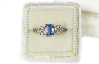 White gold ring with pale rustic blue sapphire and accent diamonds in a vintage velvet ring box