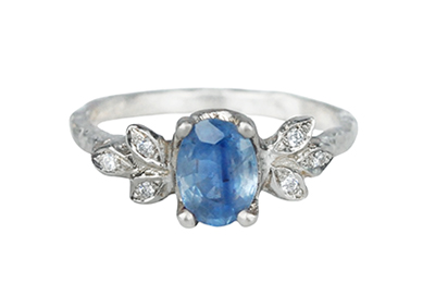 Nature-inspired 14k white gold ring featuring a rustic light-blue oval sapphire and 6 diamonds F/G VS-SI set in the six golden leaves