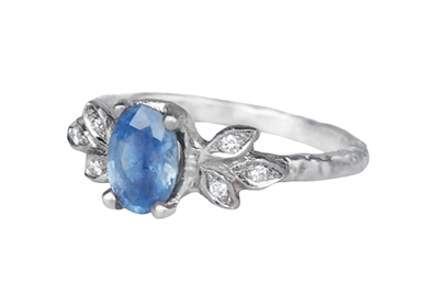 White gold ring with pale rustic blue sapphire and accent diamonds, side view