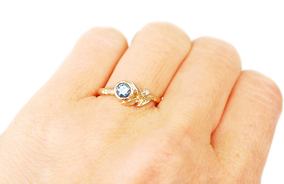Textured 14k yellow gold asymmetric Spring Leaves design in 14k yellow gold, featuring a .41ct 4.5mm Montana sapphire and a natural accent diamond