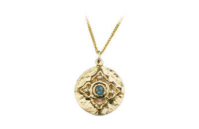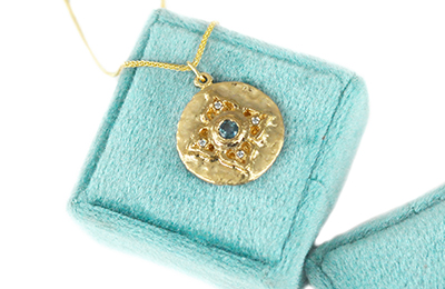 14k gold mandala medallion necklace, featuring a 3.5mm light blue sapphire and 4 accent diamonds, .02tcw, on a gold chain