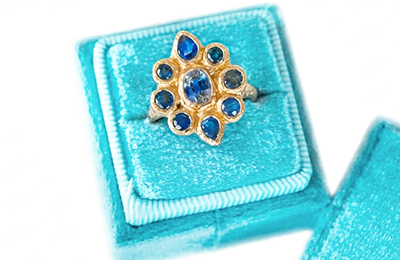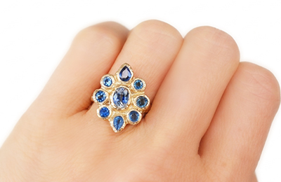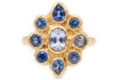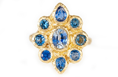 Fit for a queen, this 14k yellow gold statement ring features nine blue sapphires. A central oval 1.02ct bicolour blue-white sapphire is surrounded by two pear sapphires, and six round blue sapphires – totalling 1.45 carats.