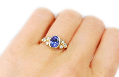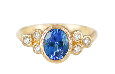 A natural oval cornflower blue sapphire, reflecting the colours of water, is cradled in hand-sculpted 14k gold, surrounded by six natural accent diamonds that flank the sapphire.