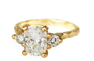 Custom Trinity ring set with a lab-created cushion diamond and two side diamonds, cast in 14k textured yellow gold