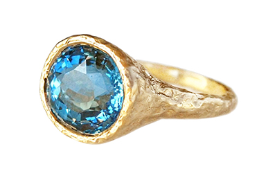 An oval large aquamarine set in textured yellow gold solitaire ring