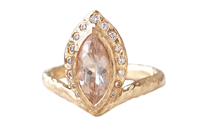 Custom 14k textured yellow gold ring featuring a a marquise 1.59ct, 5.5x11mm champagne sapphire, and 15 accent F/G VS-SI diamonds