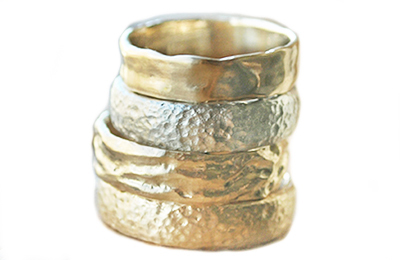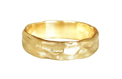 This 6mm wide 14k yellow gold band with texture and deep grooves is sculpted by hand for that rugged, natural look