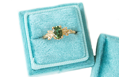 Textured 14k yellow gold ring featuring a 1.06ct (7x5mm) forest-green sapphire, and six natural accent diamonds .04tcw set in six sculpted golden leaves