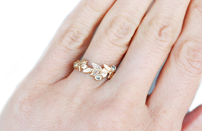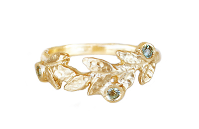 14k yellow hammered gold ring featuring three accent green sapphires set in a wreath of nine golden leaves