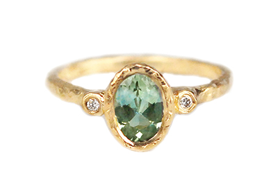 Oval green .85ct sapphire, hugged by two accent F/G VS-SI diamonds, set in a warm 14k yellow gold ring