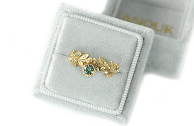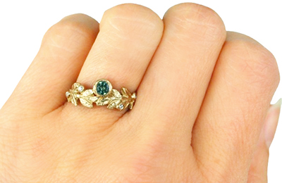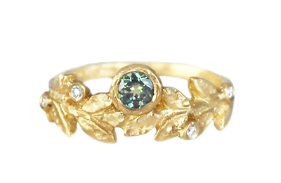 Nature-inspired 14k yellow gold wreath ring featuring a .28ct Australian green sapphire and 4 accent F/G VS-SI diamonds set between the golden leaves