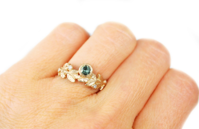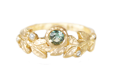 Textured 14k yellow gold centered wreath with 12 sculpted leaves, featuring a .30ct (4mm) light green sapphire and 4 accent diamonds 0.05 TCW