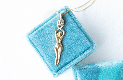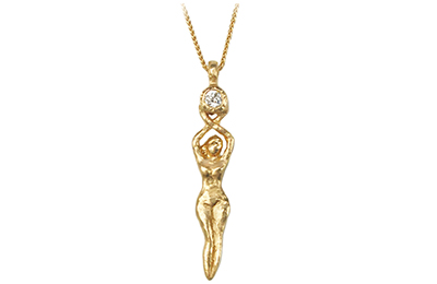 Handcrafted with devotion from 14k gold, the priestess statue is holding a round .14ct diamond, on a 16″ gold wheat chain. The figure measures 2.5 inches.