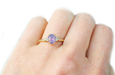 This 14k yellow gold ring features a 1.31ct oval opalescent lilac sapphire, set among 6 accent diamonds