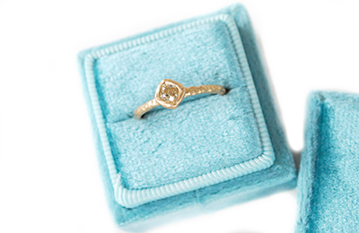 old mine cut light yellow diamond ring in textured gold, in a velvet box