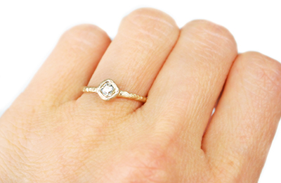 old mine cut light yellow diamond ring in textured gold, on a hand
