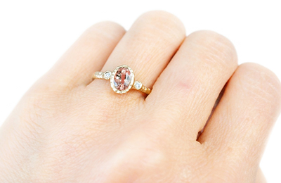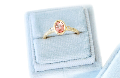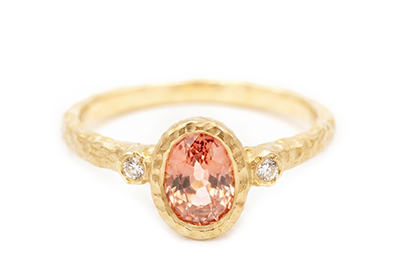 This 14k yellow gold Anais ring features a 1.11ct (7x5mm) peach sapphire, set among two natural diamonds 0.35 TCW
