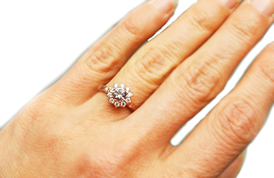 14k rose gold ring featuring a 5 – 6mm round peach sapphire and ten VS-SI accent diamonds (approximately .24TCW)