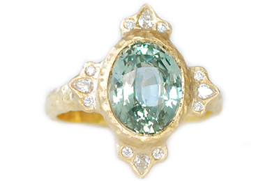 This ornate halo ring is sculpted in 14k yellow gold and features an oval 4.20ct teal sapphire surrounded in a halo of natural F/G SI diamonds, 4 pears (0.09tcw) and 8 rounds (0.05tcw)