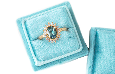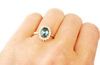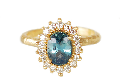 Textured 14k yellow gold ring featuring a natural 1.21ct oval teal Madagascar sapphire measuring 5.7×7.8mm, and a halo of natural diamonds .28tcw