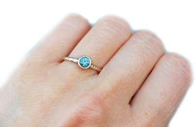 Teal sapphire textured gold ring, on hand