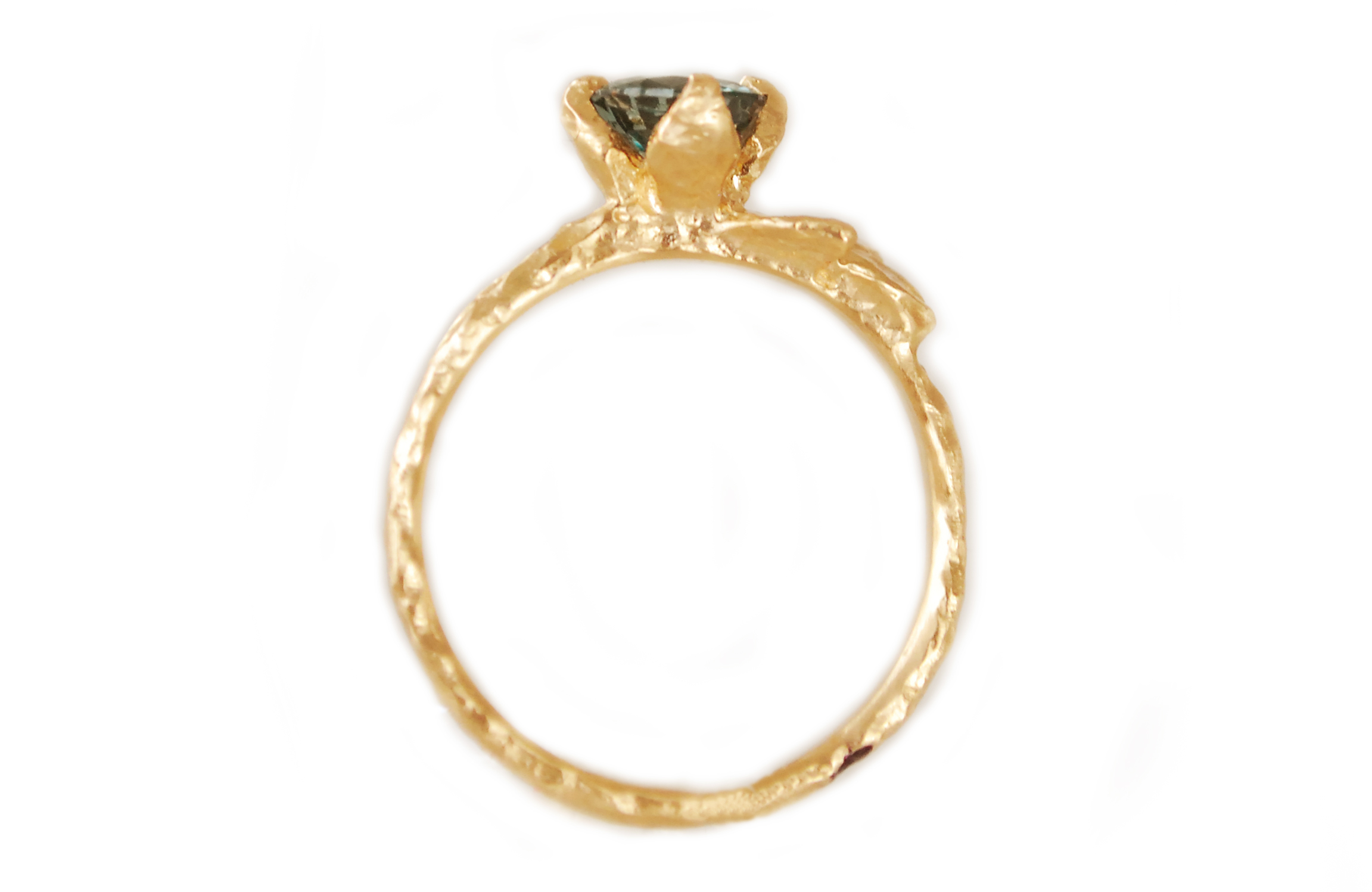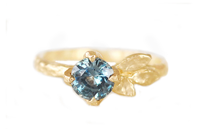 14k hammered yellow gold ring featuring a .84ct 5.4mm teal round sapphire set in prongs among three sculpted golden leaves