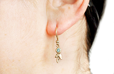 Whimsical nature-inspired gold earrings with aquamarines. The delicate leaf design adds a touch of elegance to your look. The watery aquamarines nestled within create a lively contrast with the warm golden glow. These earrings make a charming addition to any jewelry collection.