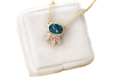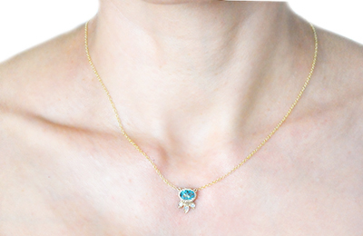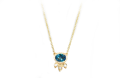 14k gold pendant on a 16″ chain, featuring an oval London-blue topaz set among three golden leaves with three accent diamonds, F/G VS-SI. Available in yellow, rose or white gold and set with a variety of gemstones.