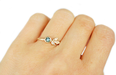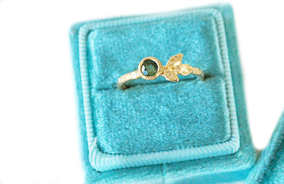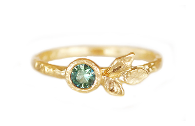 14k hammered yellow gold ring featuring three golden leaves and a 4mm 0.27ct green sapphire