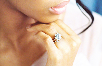 A vintage-inspired cluster ring, sculpted in organically textured white gold. At its centre glows an aqua-blue moissanite, encircled by a shimmering halo of white moissanites – a little constellation of light for the woman who carries the sea within her.